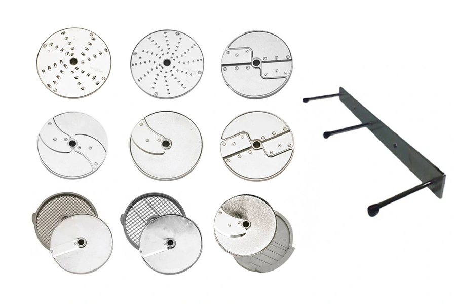 12 дисков: ломтик.2 и 5 мм, терка2и 5мм, сол 3х3 и 4х4, куб.10х10, 20х20, фри 10х10 + настен. держатель.  изготовлены из алюминия. Подходят для моделей CL50, 52, 55, 60