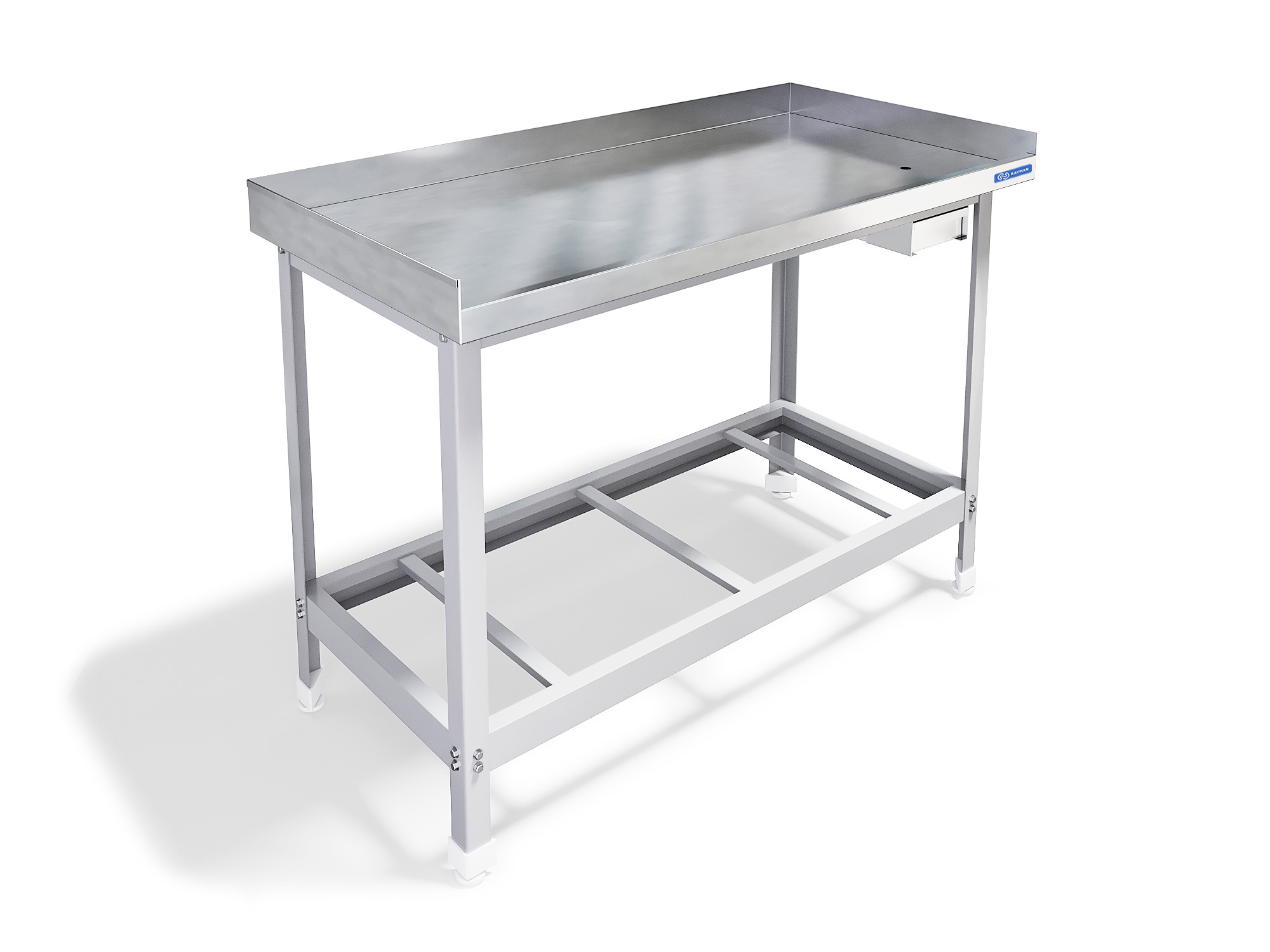 1200х700x850, каркас разборный, уголок из оцинкованного металла толщиной 1,5 мм, полка-решетка оцинковка, толщиной 0,8 мм, рабочая поверхность нержавеющая сталь AISI 430 толщиной 0,8 мм,усиление ЛДСП 16 мм, борт плоский с трех сторон,  лоток для слива жидкости