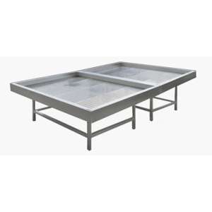 2000х1500х1030мм, Стол для выкладки рыбы на льду без агрегата, ванна из нержавеющей стали марки AISI 304 толщиной 1мм. Панели обшивки из нержавеющей стали марки AISI 430 толщиной 0,8мм. Сливные трубки диаметром 20 мм 2шт. Внутри ванны перфорированный поддон из нержавеющей стали марки AISI 430 толщиной 0,8мм для аккумулирования холода. Подставка разборная из трубы 40х40 нержавеющей стали марки AISI 304 толщиной 1,2мм. Регулируемые опоры. Стол поставляется в разобранном виде.