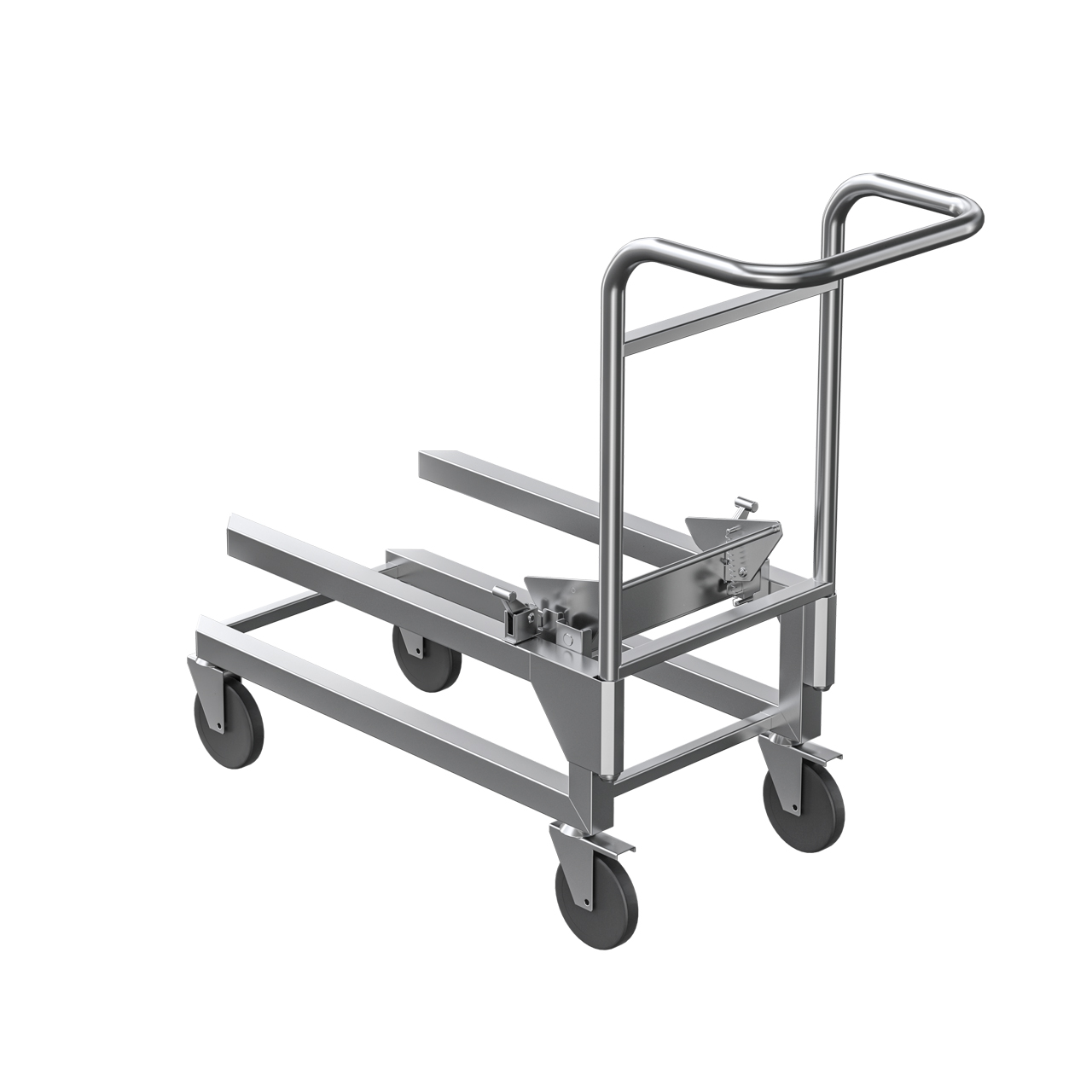 1062х408х915мм, нержавеющая сталь AISI304. Максимальная распределенная нагрузка 100кг. Тележка  ТСШ-01-20 А  для пароконвектомата ПКЭ-20-И А предназначена для установки и перемещения стеллажа-шпильки СШ-01-20-И А с гастроемкостями пароконвектомата . Все кромки тележки имеют фальцовку. Тележка имеет механизм надежной фиксации стеллажа-шпильки СШ-01-20-И А. Рычаг фиксатора педальный упрощает загрузку стеллажа-шпильки в пароконвектомат.  Две из четырёх колёсных опор оснащены тормозом.