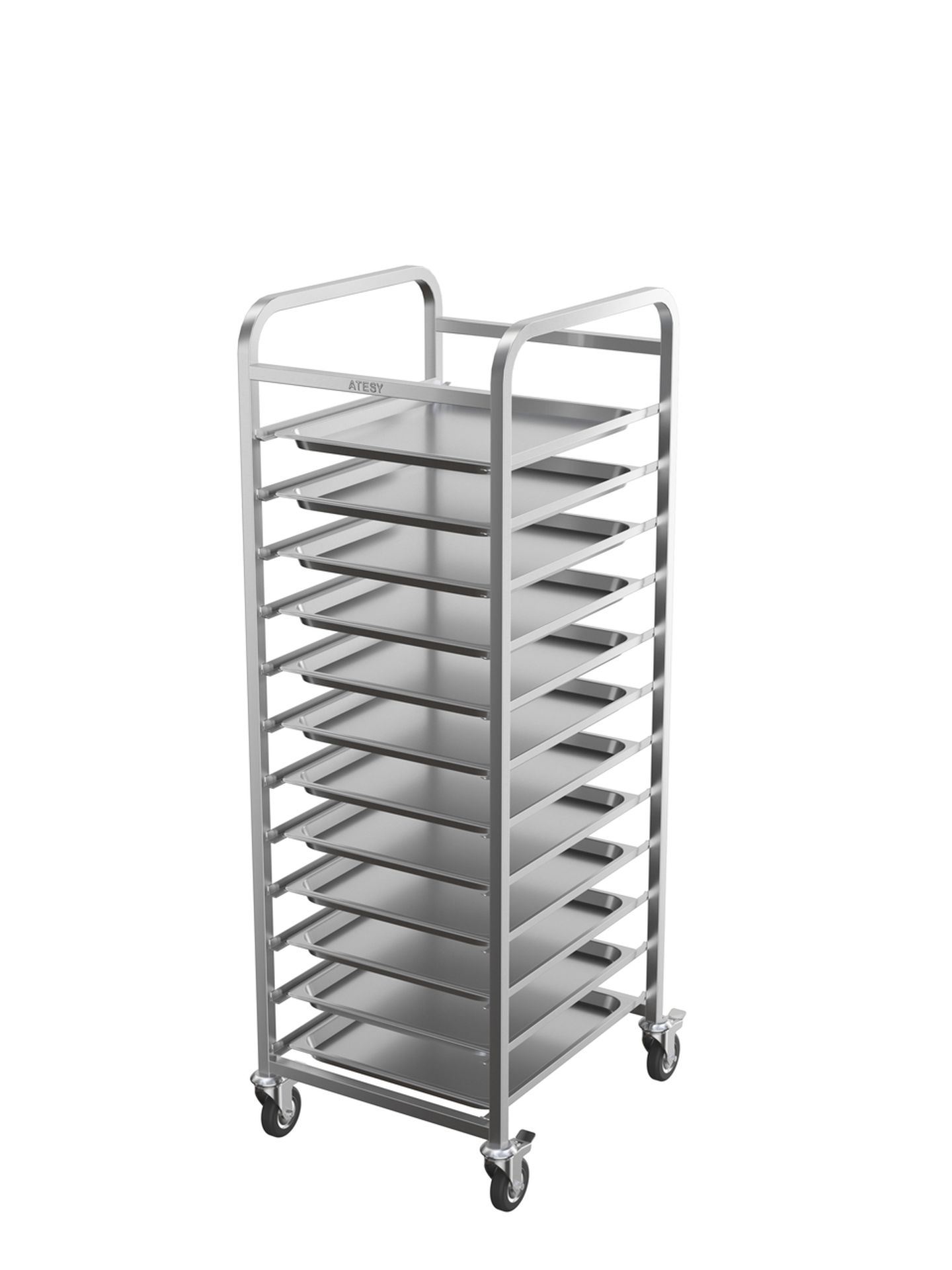 530х600х1575 мм, сварная, AISI304, на 12 противней 470х580 мм, 2 колеса с тормозом, диаметр колес 100 мм, расстояние между направляющими 105 мм
