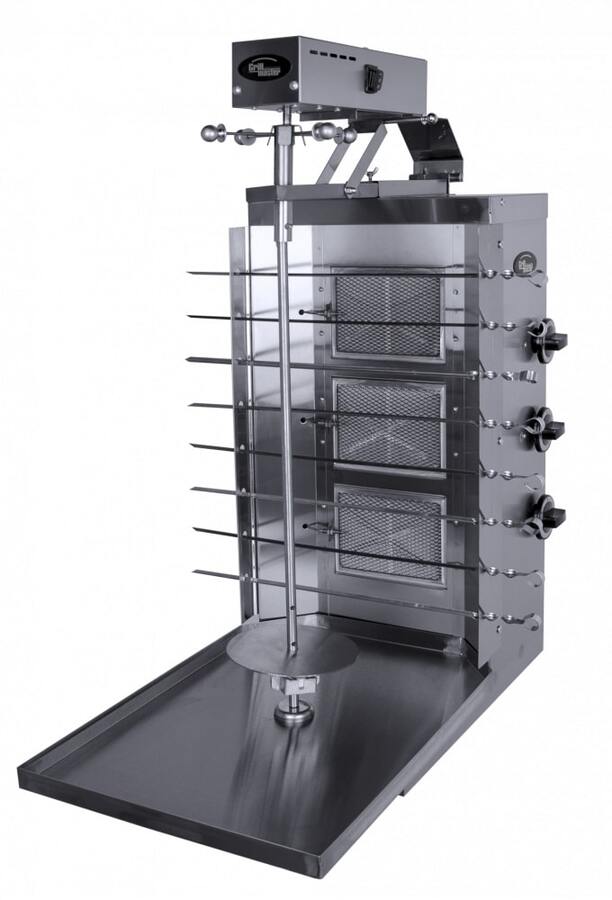 428х765х982мм, Новая модель! Новый, мощный мотор вращения центрального шампура, 3 горелки с ситемой газ-контроль обеспечивают лучшую тепловую обработку продукта, производительность до 70 кг мяса в автоматическом режиме, усовершенствованная механика вращения шампура, 8 шампуров для приготовления шашлыка, поддон для мяса, полностью из нержавеющей стали, настроена на пропан,  масса 32 кг, 10,5 кВт, г. нетто 428х765х982, 0,6 кг/ч; 1,11 м3/ч, г.брутто550х900х1200, 40 кг