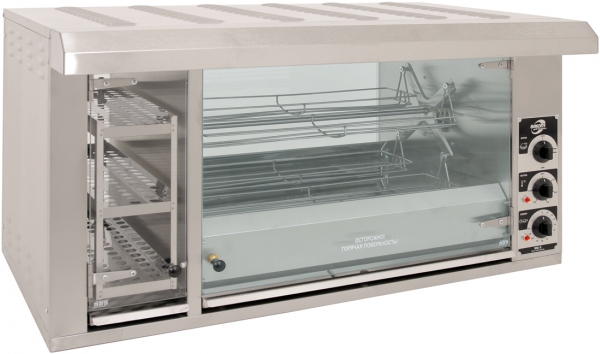 1030*650*580мм, Гриль для кур электрический карусельный, 1 камера, загрузка 12 кур, нерж.сталь, электромех.управление, крыша с подсветкой, тепловая витрина. В комплекте вертел съемный, 4 люльки-корзины, поддон, кассета витрины, поддон витрины