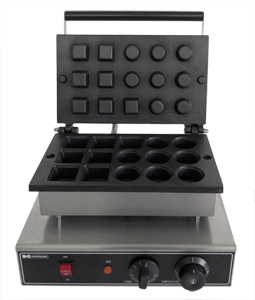 360x310x225, 1,5 кВт, 220В, материал - литой алюминий с антипригарным покрытием, форма вафель - микс из 2-х видов тарталеток (круглые - диаметр 4,3см и квадратные - 4,3х4,3см), количество - 15шт.