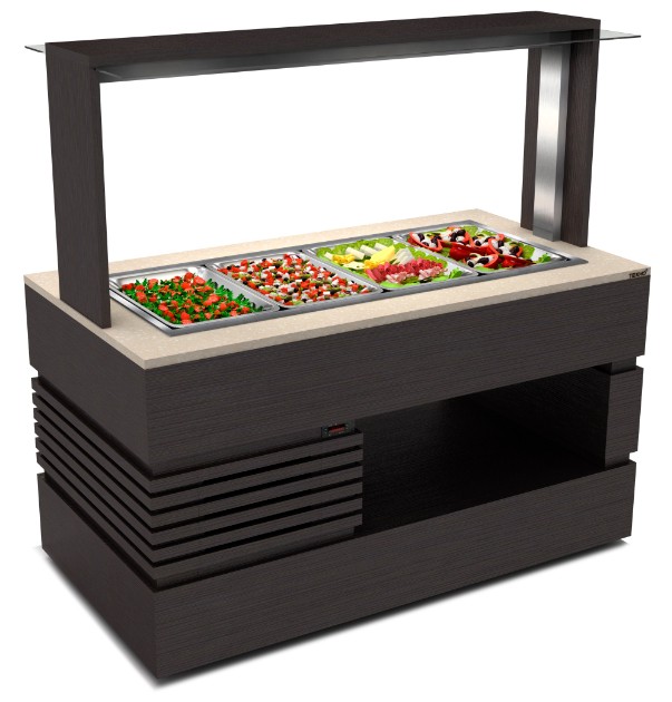 1616х851х1555мм, Буфет с охлаждаемой ванной. Без направляющих. Каркас изготовлен из оцинкованной стали толщиной 1,5 мм. Фасад из ШПОН+МДФ толщиной 16мм, столешница из искуственного камня толщиной 24мм. Цвет - венге, ниша, полка закрытая центральная, подсветка, под четыре GN 1/1, компрессор АСС, мощность 0,262кВт. Поставляется в собранном виде.