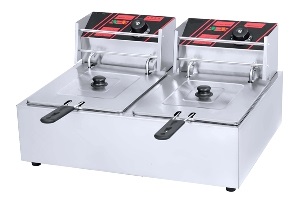 570x450x310мм, 6+6л, с крышкой, 2x2,5кВт, 220В, 8,6 кг, размер корзины (без ручки) 180x210x100мм, материал корпуса: нержавеющая сталь, температурный режим 60-200 С°, емкости для масла легко снимаются, в комплектацию входят корзины и крышки