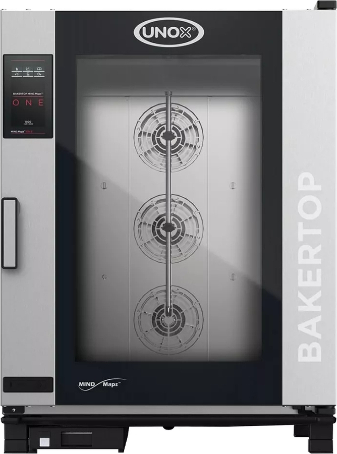 Пароконвектомат электрический инжекторный для выпечки и гастрономии с универсальными направляющими,  серии BakerTop MIND.Maps Countertop, с функцией прямого пара (инжекторная), вместимость 10 противней 600х400мм или 10 противней gn 1/1, с сенсорным программируемым управлением One, подсветкой, одноточечным щупом, 3 вентиляторами с автореверсом, автоматической системой мойки, левой дверью.