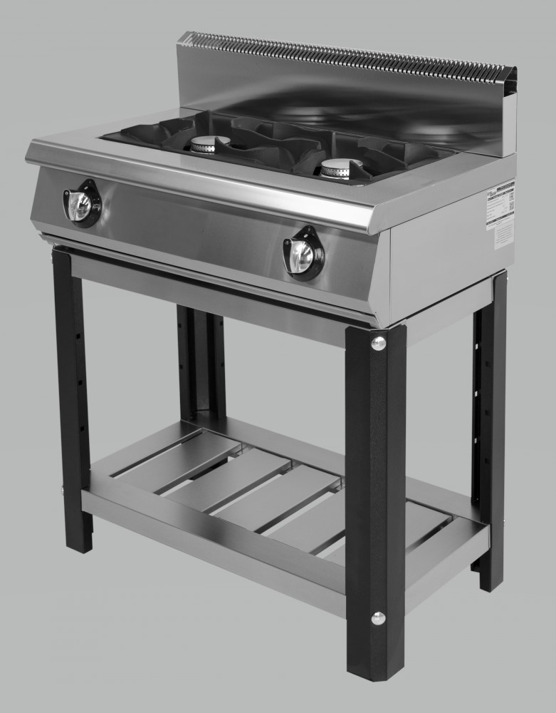 2 профессиональные  чугунные горелки, газовая мощность 13 kW, газ контроль, полностью из н/стали, 1 нейтральная полка из н/стали г.нетто 800х500х1050, 53кг, г.брутто: 950х650х630, 78кг.