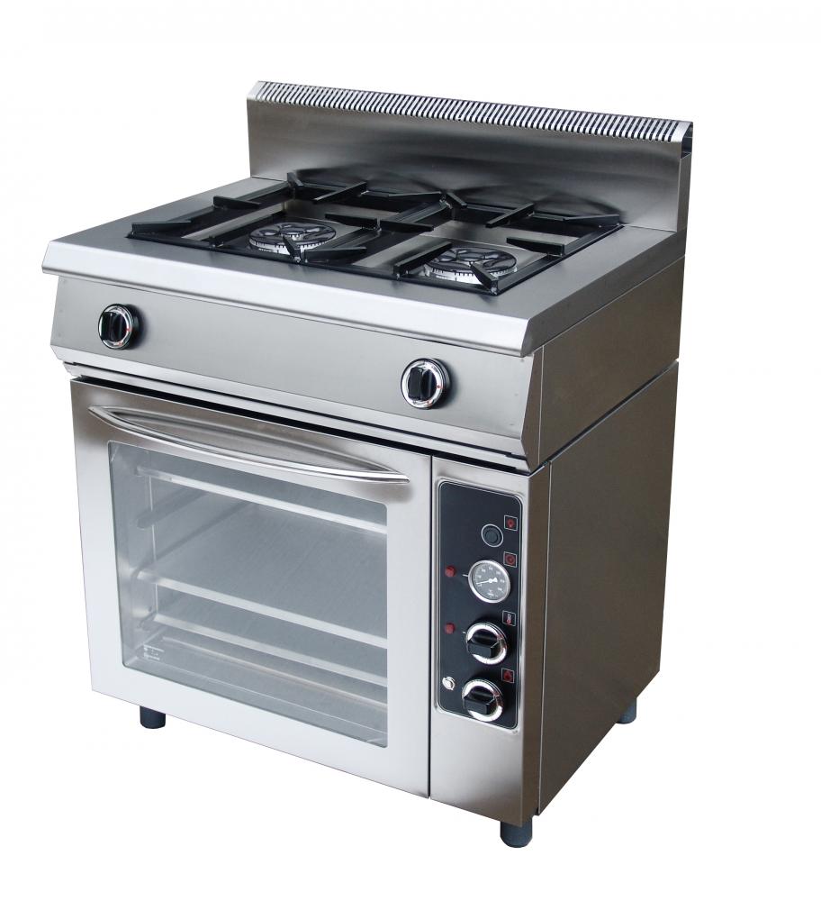 2 профессиональные горелки класса Heavy Duty, газ-контроль, комбинированная (сверху ТЭН, снизу горелка) духовка со стеклянной дверцей.