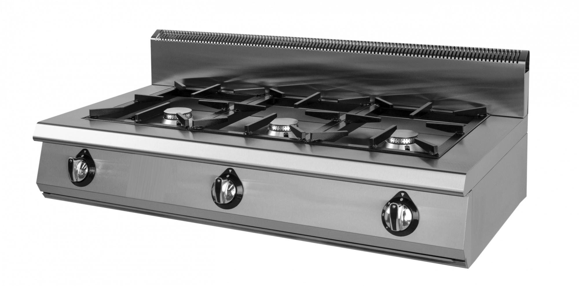 3 профессиональных горелки класса Heavy Duty, газовая мощность 19,5 kW, газ-контроль, настольный вариант, полностью из н нержавеющей стали.