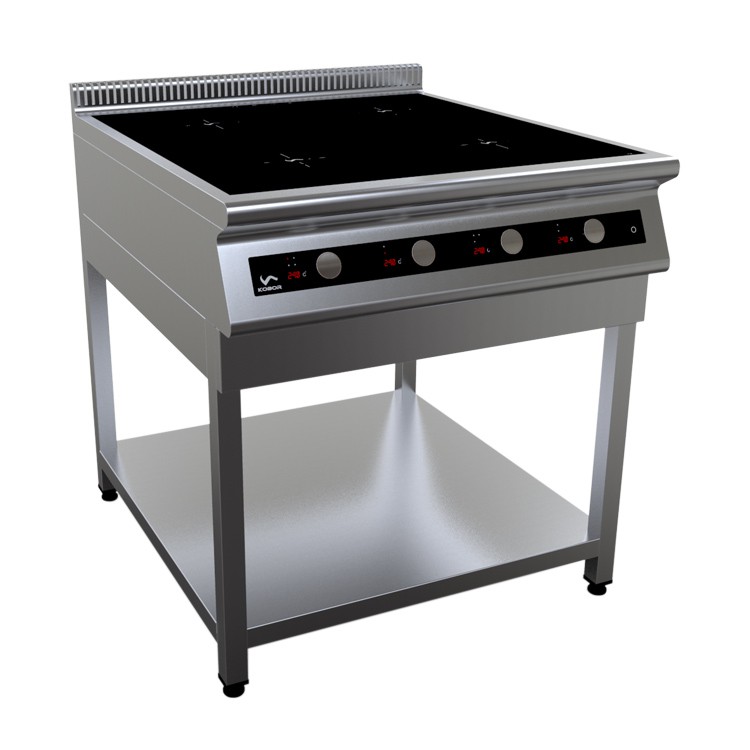 800х900х870 Плита индукционная  на открытой подставке, 4 конфорки  мощностью 4х3,5кВт, электронная панель управления с цифровой индикацией,  13 уровней нагрева, таймер до 180мин., съемный жировой фильтр, корпус из н.с. AISI 304, регулируемые по высоте ножки, рабочая поверхность - стеклокерамика 6мм, 14 кВт, 380В.