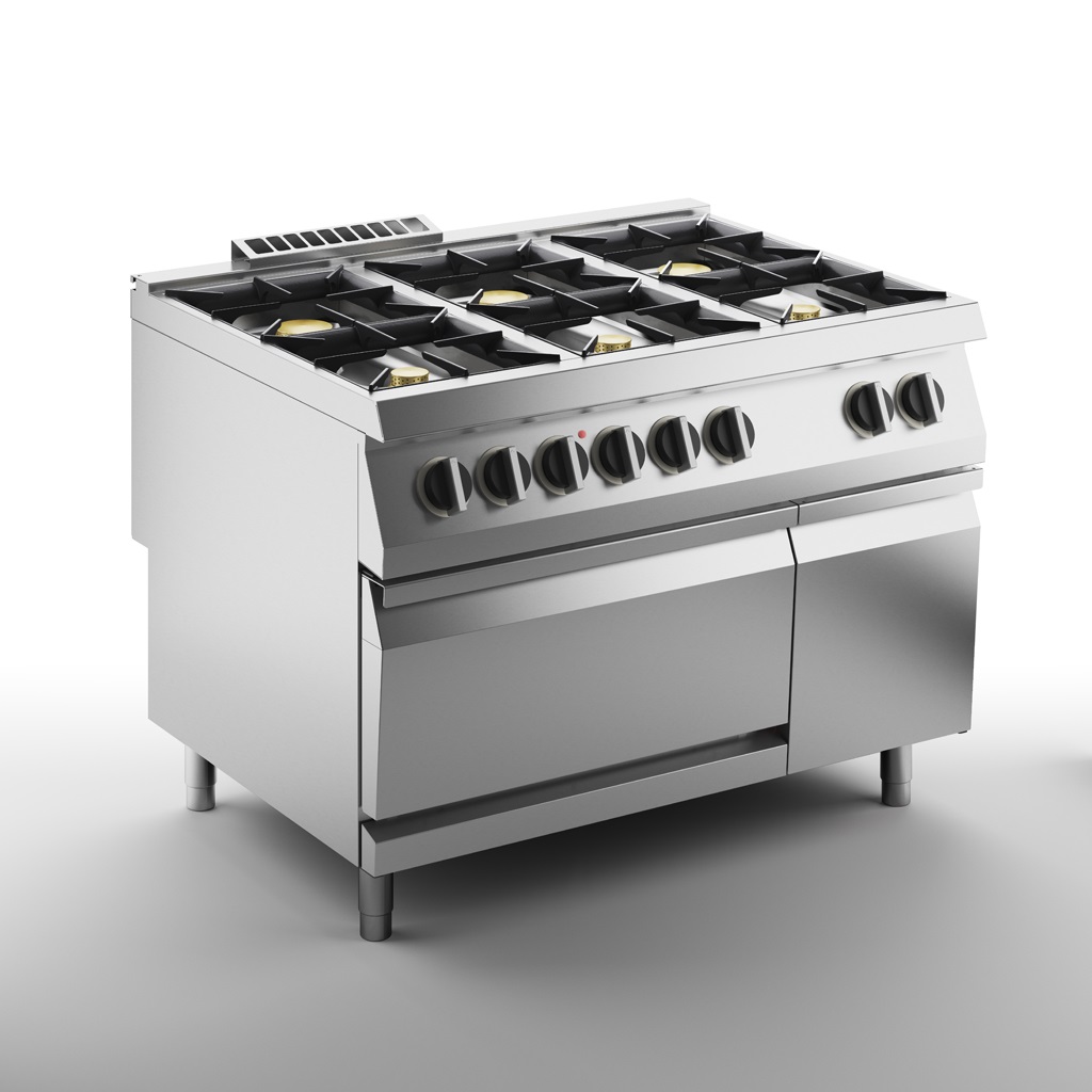 1200х900х900 мм, 216 кг, газ 42 кВт, 380 В, 6 конфорок, на электрическом духовом шкафу на 6 кВт