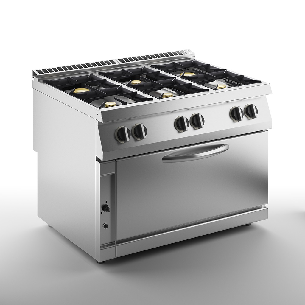 1200х900х900 мм, 250 кг, газ 54 кВт, 6 конфорок, на газовом духовом шкафу на 12 кВт