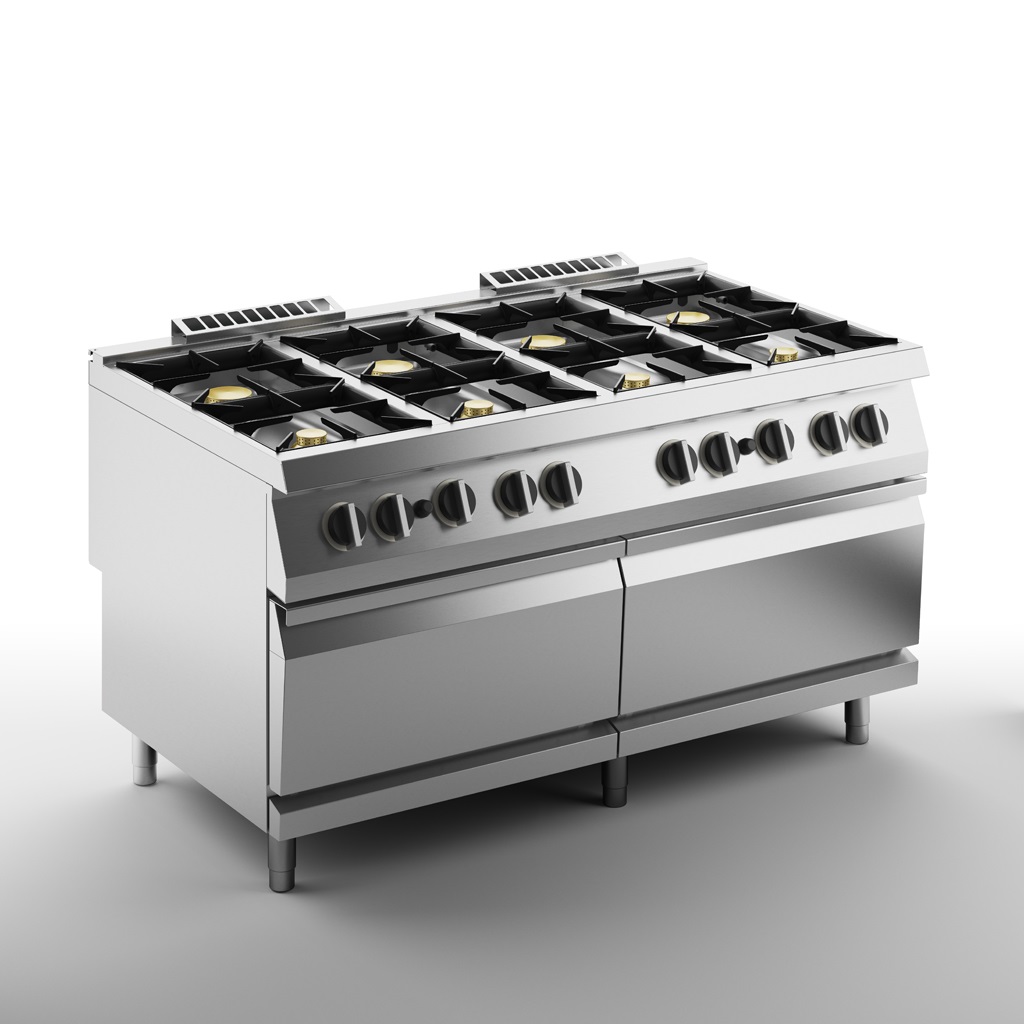 1600х900х900 мм, 309 кг, газ 70 кВт, 8 конфорок, на двойном газовом духовом шкафу на 16 кВт