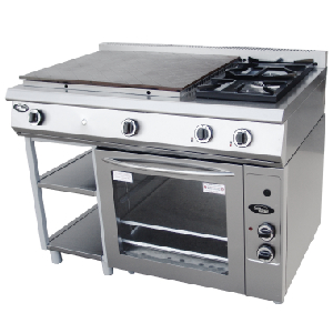 1180x800x1050 мм, 2 горелки закрытого типа 11.5х2, 2 чугунные горелки открытого типа с запальной системой розжига класса Heavy Duty (2х6 kW), газовая мощность 35 kW, духовка GN 2/1 из н/стали, подсветкой и стрелочным термометром: сверху горелка 4.5 kW, снизу горелка 4.5 kW, духовка с термостатическим управлением, дверь духовки со стеклом(закаленным), настроена на метан (сопло на пропан в комплекте), г.нетто 1180x800x1050, 207кг, г.брутто:1330х950х1200, 232 кг, электророзжиг, газ контроль, н/сталь