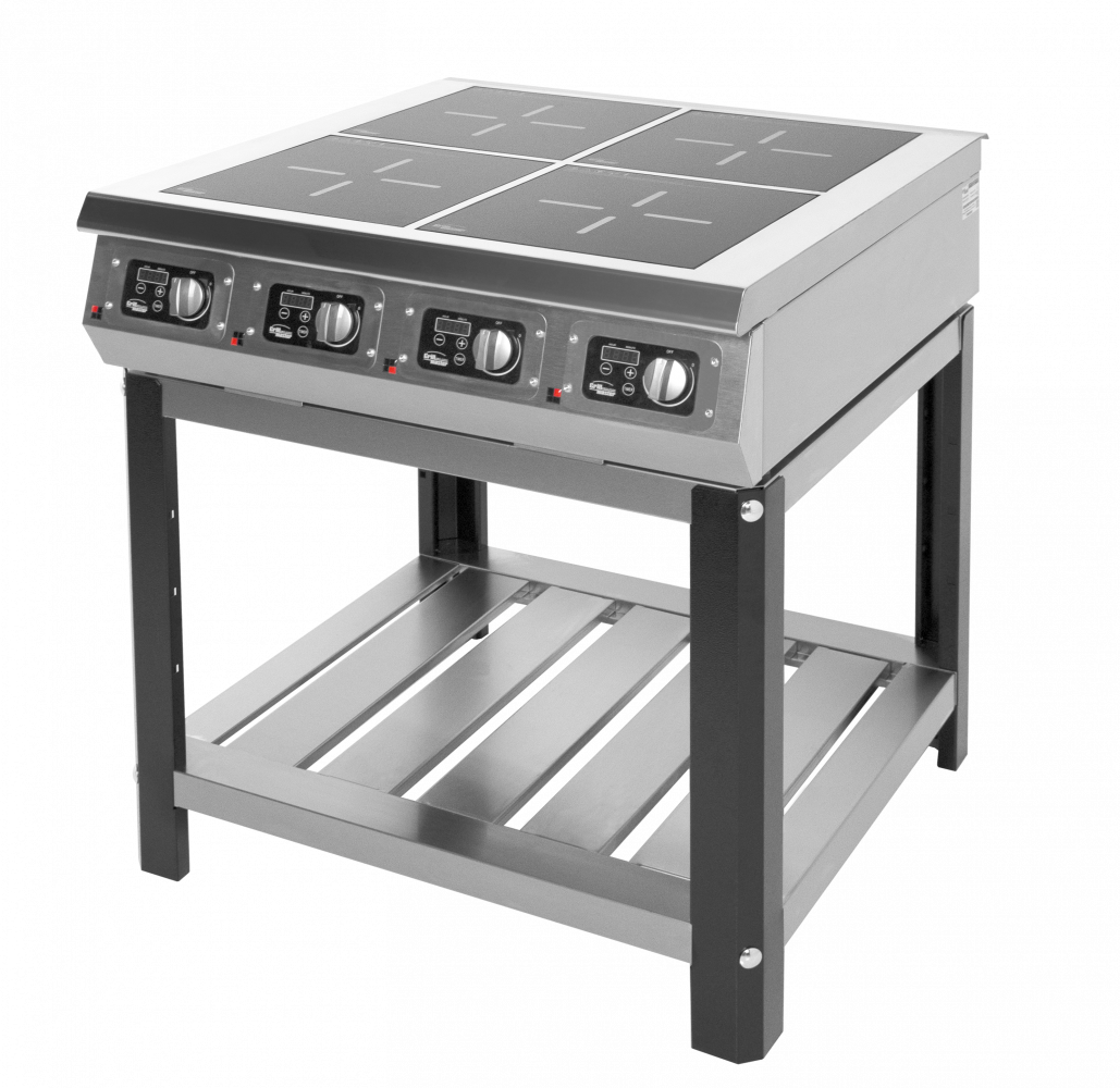800х800х882мм, Плита 4-х конфорочная индукционная Ф4ИП/800 (на подставке), электрическая индукционная, 4 зоны нагрева, размер конфорки 320х340 мм, сенсорное и механическое управление с ЖК-дисплеем, увеличенная в диаметре катушка, 10 уровней мощности, мощность 1 зоны 3.5 кВт, электронный таймер 0-24 ч, максимальный допустимый вес на 1 конфорку до 30 кг, min диаметр посуды 100 мм, не требует специальной посуды, выполнена полностью из нерж.стали, разборная конструкция плиты и подставки, 14 кВт, габариты нетто 800х800х882, 54 кг, брутто 890х890х700, 78 кг