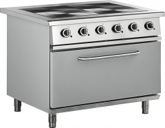 1050х850х860мм, 400В,4 конф, 15 кВт, духовой шкаф - 4 кВт. 4 чугунные разборные конфорки 285*415 мм. образуют ровную поверхность (2 конф. х 3 кВт + 2 конф. х 2.5 кВт) Облиц.- нерж. сталь . Дверь духовки, задняя, боковые стенки - оцинкованная сталь, покрытая порошковой краской, ножки нерж. сталь . Станд. комп.: противень из углеродистой стали (525*480*30мм, ) - 3шт.