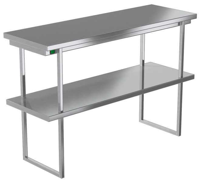 1200х300х800 Полка тепловая настольная разборная, 2 яруса, комбинированная, верхний уровень с подогревом, нижний без подогрева. Температура в зоне действия нагревательного элемента, не более, °С +60±5°С.  Полки из нержавеющей стали марки AISI 430 толщиной 0,8мм, каркас труба 20х20 из нержавеющей стали марки AISI 430 толщиной 1,2мм. Мощность 1,2кВт. Поставляется в разобранном виде., вес 11,3кг