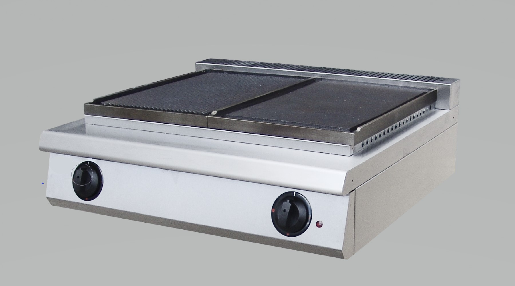 2 жарочные поверхности (гладкая, рифленая) из чугуна, 2 пакетных выключателя (4 позиции), рабочая температура ~300C, мощность 6 кВт.